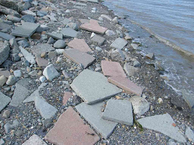 It was covered in broken paving slabs which only added to the mystery — but they were a great help in negotiating this uneven terrain. We went right down to the water’s edge because the beach was flatter there. But then the slabs ran out and walking became more problematic. It was only for a short way, soon we were able to get up on to a grass bank and found ourselves on an established path once more.
