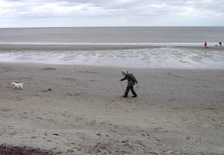 Three miles into this Walk, we had hiked a thousand miles since we left Bognor! We continued northwards along the prom out of Scarborough. I looked over towards the beach and saw a bent old man striding along the sand with his dog.